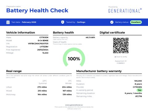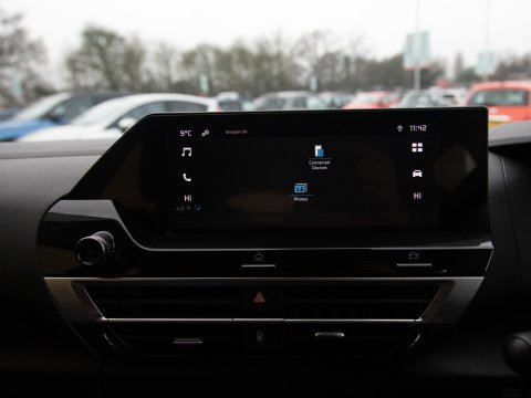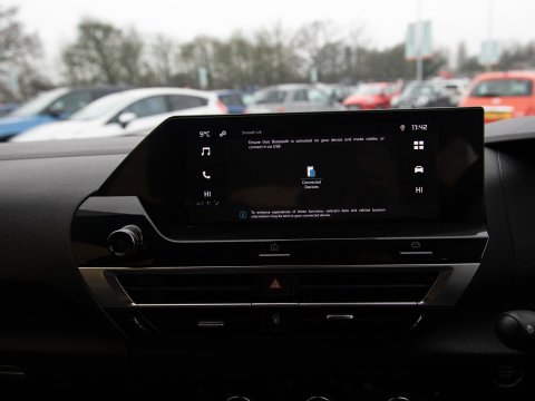 This 2024 Citroen e-C4 Sense is a remarkably low mileage electric vehicle, having covered just 12,216 miles. As a Sense trim, this electric model boasts a 50 kWh battery with a battery health of 100% offering a maximum range of 220 miles when new. Recharging at home using a 7kW charger takes approximately 7 hours and 30 minutes, while rapid public charging can take the battery from empty to 80% in as little as 32 minutes. This Citroen also features satellite navigation (Sat Nav) to keep you on track on longer journeys, automatic, LED headlights for clear visibility, and rear parking sensors to aid manoeuvring.