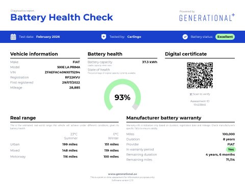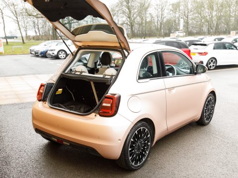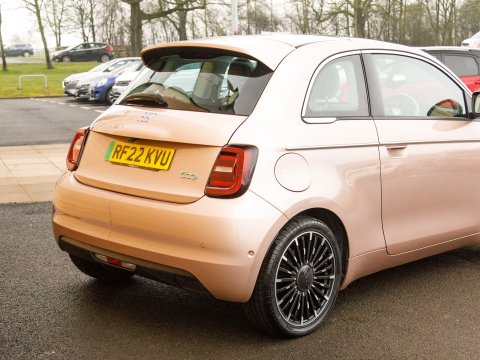 Discover this 2022 Fiat 500e La Prima, With its 42 kWh battery with a battery health of 93% this model boasts a maximum range of 193 miles when new. The La Prima trim level comes equipped with a host of desirable features designed to enhance your driving experience. Enjoy the open air with the panoramic sunroof, and navigate tight spaces with ease thanks to the Rear Camera and Parking sensors. Sat Nav will keep you on track on those long journeys. Stay connected and entertained with wireless Apple CarPlay and Android Auto, while the automatic air conditioning ensures a comfortable cabin temperature. The distinctive LED headlights provide excellent visibility, ensuring you stand out and drive with confidence.